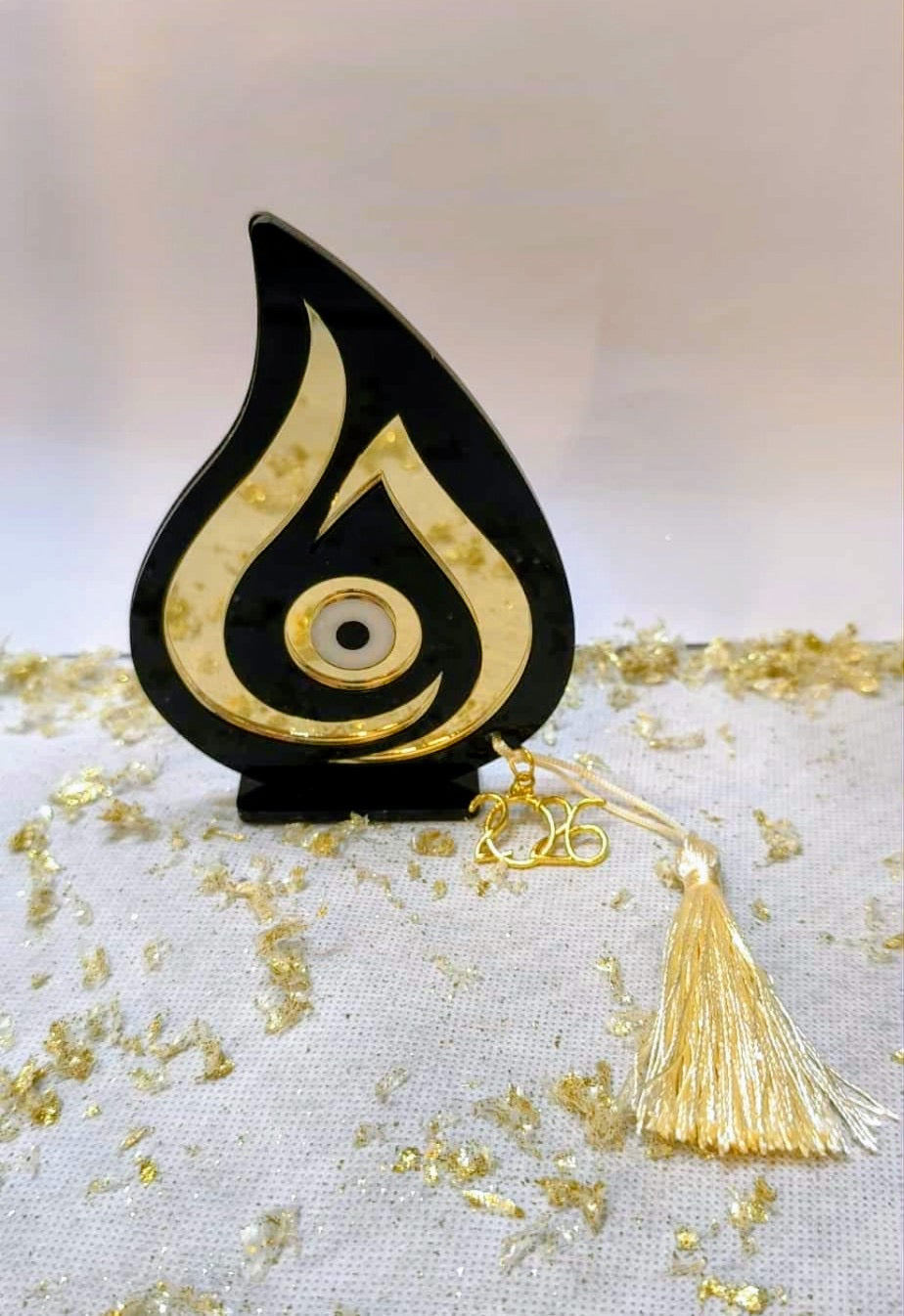 Γούρι μάτι φωτιά σε μαύρο plexiglass και χρυσό καθρέφτη ,μπεζ χρυσό κρόσσι και χρυσό μεταλλικό 2026.