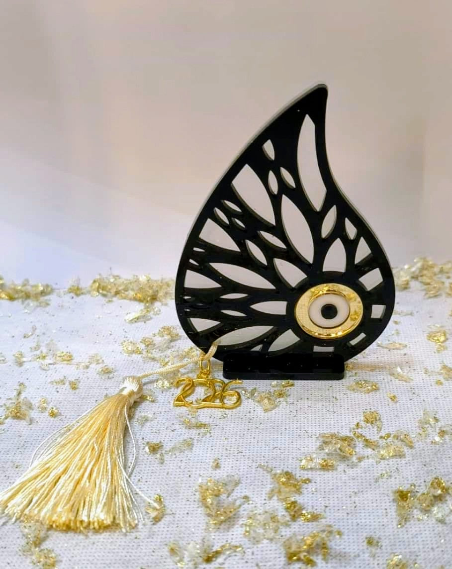 Γούρι σκαλιστό μάτι σταγόνα σε μαύρο plexiglass και χρυσό καθρέφτη,με μπεζ χρυσό κρόσσι και χρυσό μεταλλικό 2026.