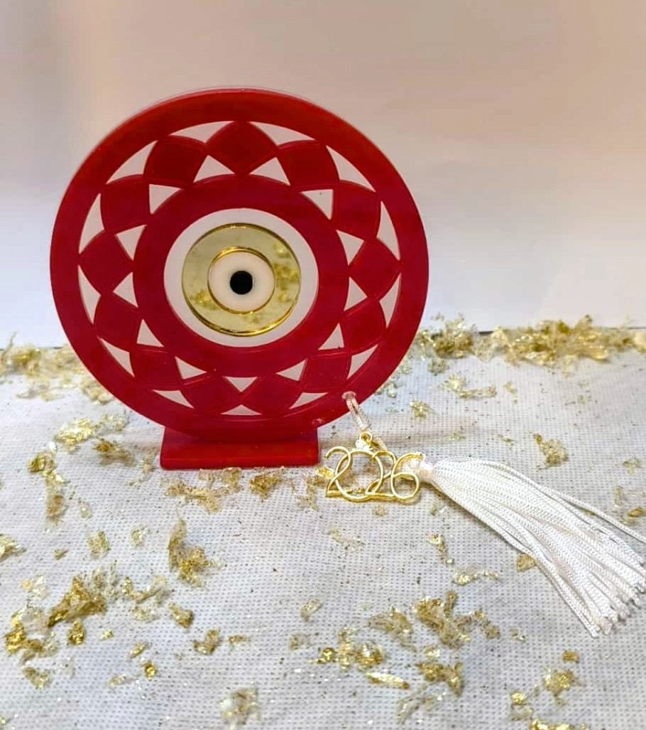 Γούρι στρογγυλό μάτι σε κόκκινο plexiglass με λευκό κρόσσι και χρυσό μεταλλικό 2026.