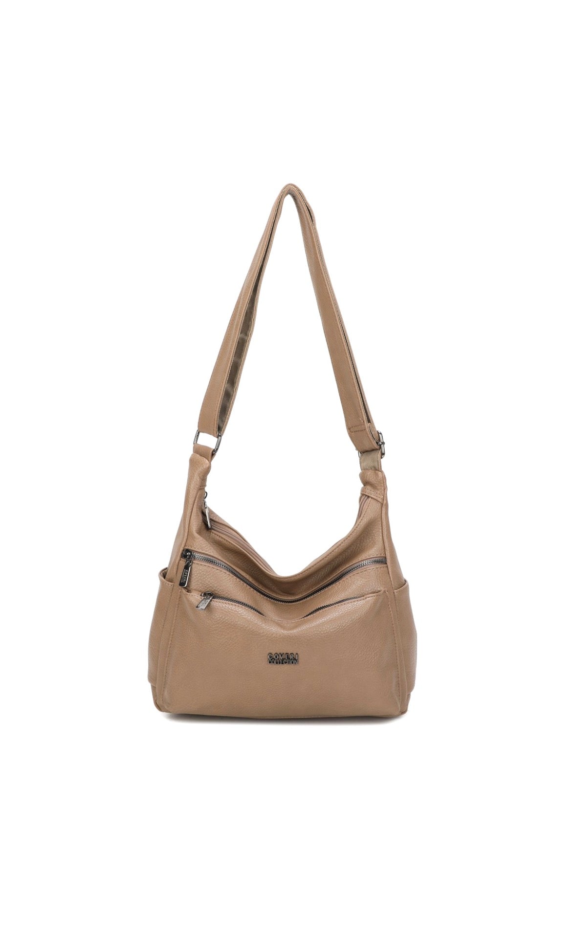 Γυναικεία τσάντα Coveri δερματίνη χιαστί ή ώμου. Διαθέτει δύο μπροστινές τσέπες με φερμουάρ, εσωτερικό με θήκες οργάνωσης και εξωτερική τσέπη στο πίσω μέρος. Ρυθμιζόμενο λουρί . Διαστάσεις: Πλάτος 32 × Ύψος 23 × Πάτος 10 εκ.