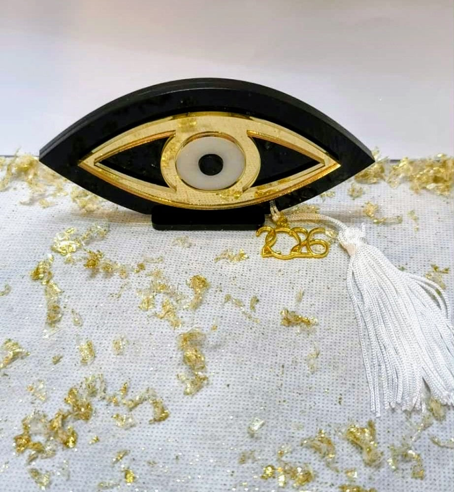 Μάτι μαύρο plexiglass , χρυσό καθρέφτη με λευκό κρόσσι και χρυσό μεταλλικό 2026.