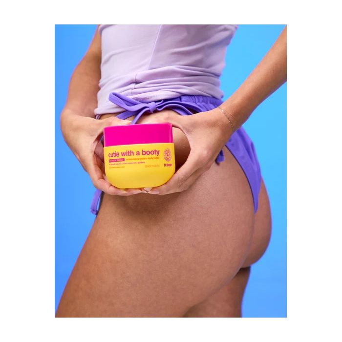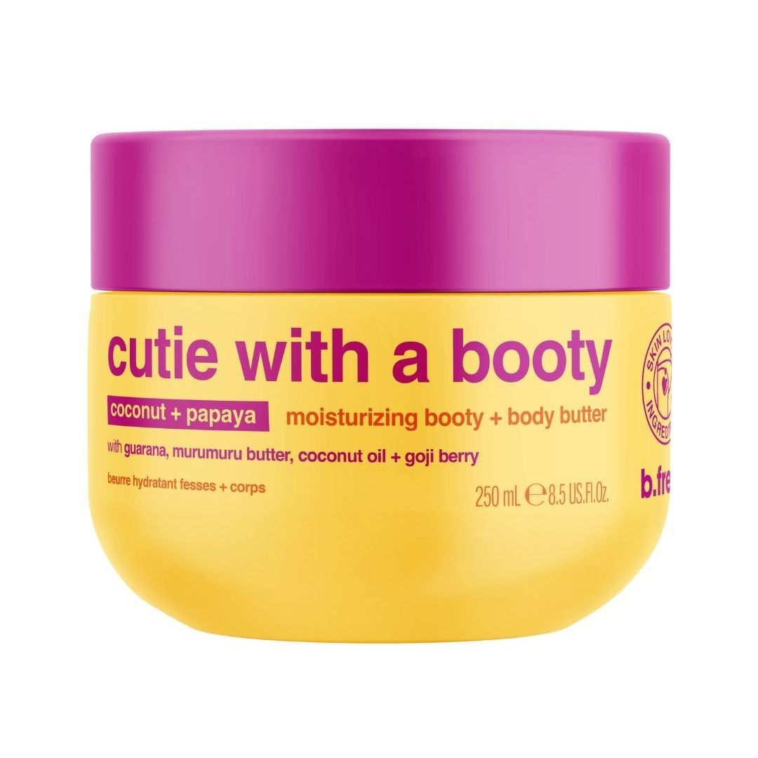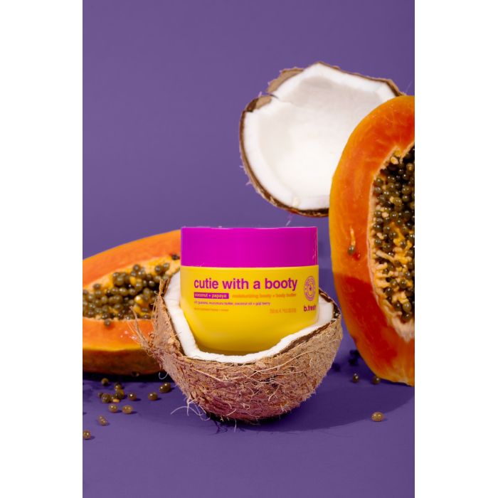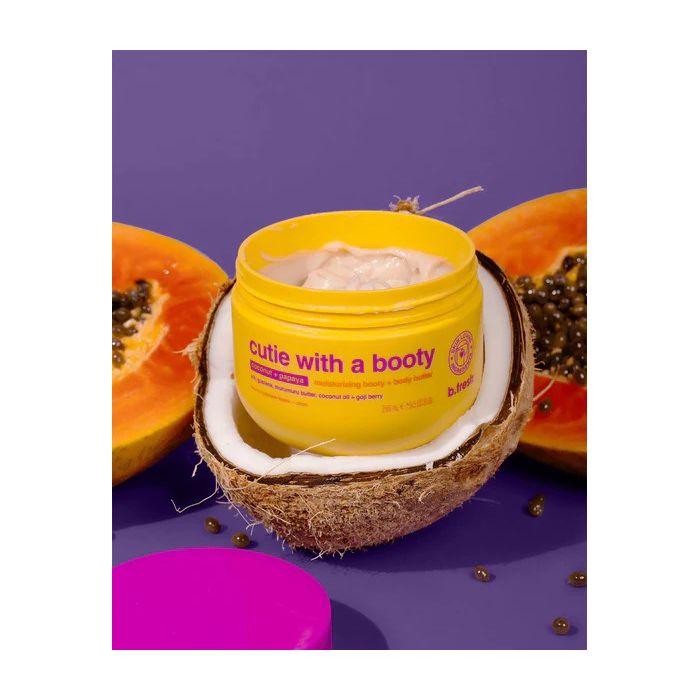Treat your skin to the luxurious care of B.Fresh Cutie With A Booty Moisturising Booty + Body Butter. This rich 250ml body butter has been specially designed to provide intense hydration and nourishment to both the body and buttocks. Enriched with beneficial ingredients such as Guarana, Murumuru Butter, Coconut Oil and Goji Berry, it leaves the skin softly velvety, smooth and elastic. Firming & Smoothing – With guarana extract (even more powerful than caffeine!), which enhances microcirculation and contributes to the visible tightening and toning of the skin. Explosive combination of papaya & coconut for intensive hydration and a discreetly clean scent. Paraben-free, vegan friendly. Only ingredients that love your skin!