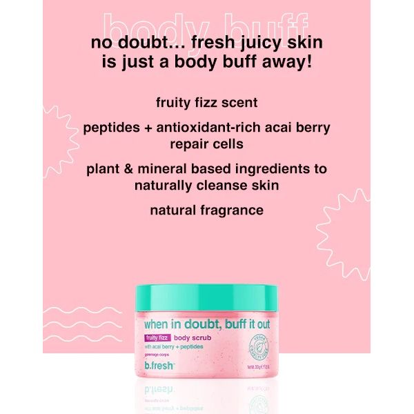 Give your skin a boost with this super gentle body buff. Fruit enzymes slough away dulling dead skin cells to reveal radiant, fresh skin and smooth your skin's texture. Peptides help rebuild and restore moisture to the skin. Infused with a fruity scent that will leave you smelling and feeling great + fresh. You'll love it because: Packed with antioxidant acai berries + cell-repairing peptides. Infused with an amazing fruity scent to leave you with the best-smelling + radiant skin. Paraben free. aluminum free. alcohol free. cruelty free.