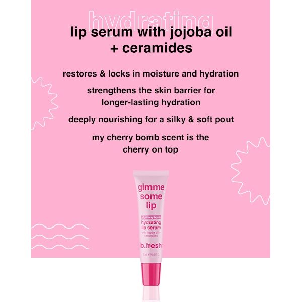 A hydrating, reconstructive lip serum that gives your lips the extra love they need. Jojoba oil absorbs easily to deeply nourish and soothe dry, chapped lips, while ceramides help restore and hydrate your lips for irresistible luscious lips! With a delightful cherry scent that will make many want a taste of these lips. Gentle on the skin's microbiome, Paraben free, cruelty free, 100% vegan.