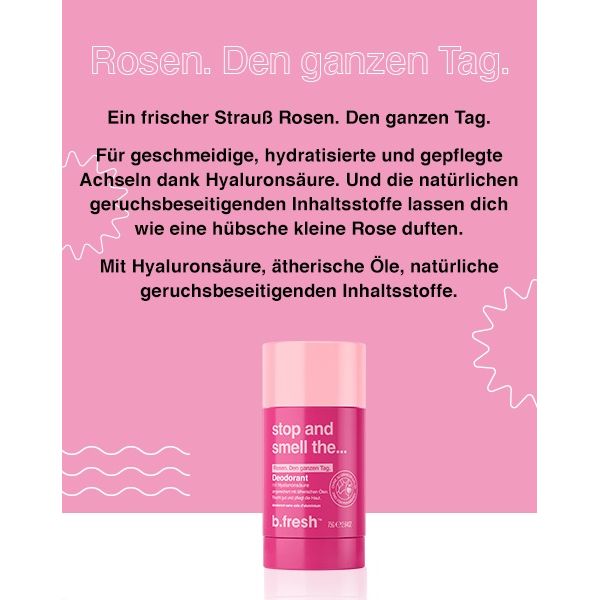 Stop and smell the... roses! We know you're busy, but every now and then you have to stop to enjoy the scent of roses. Alcohol-free deodorant, naturally scented with rose, enriched with hyaluronic acid and conditioning agents for the sensitive underarm area. It doesn't contain thorns, but it contains all the wonderful scent of a blooming rose! Paraben free. aluminium free. alcohol free. natural fragrance. cruelty free.