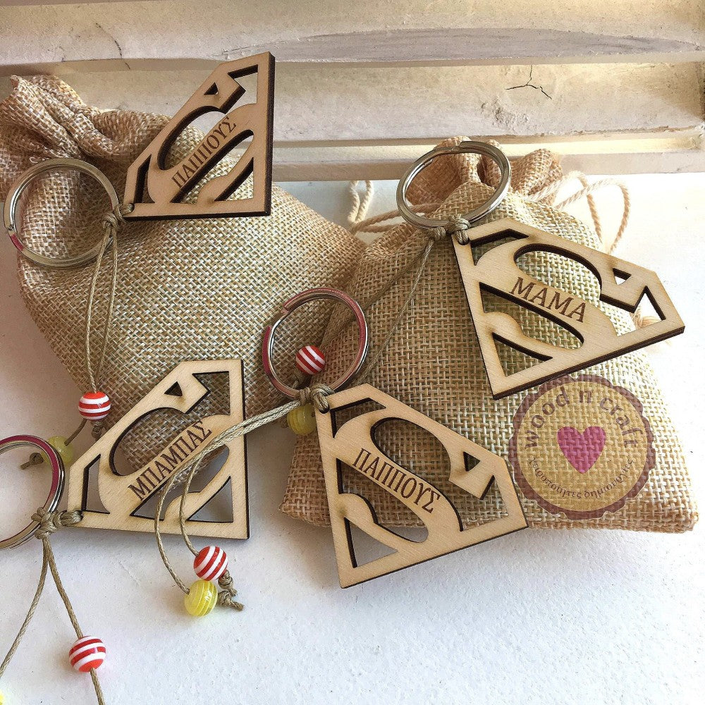 Wooden handmade keychain in the design of Superman's badge.. and engraving for Super dad, grandpa, godfather, a name or any other word!