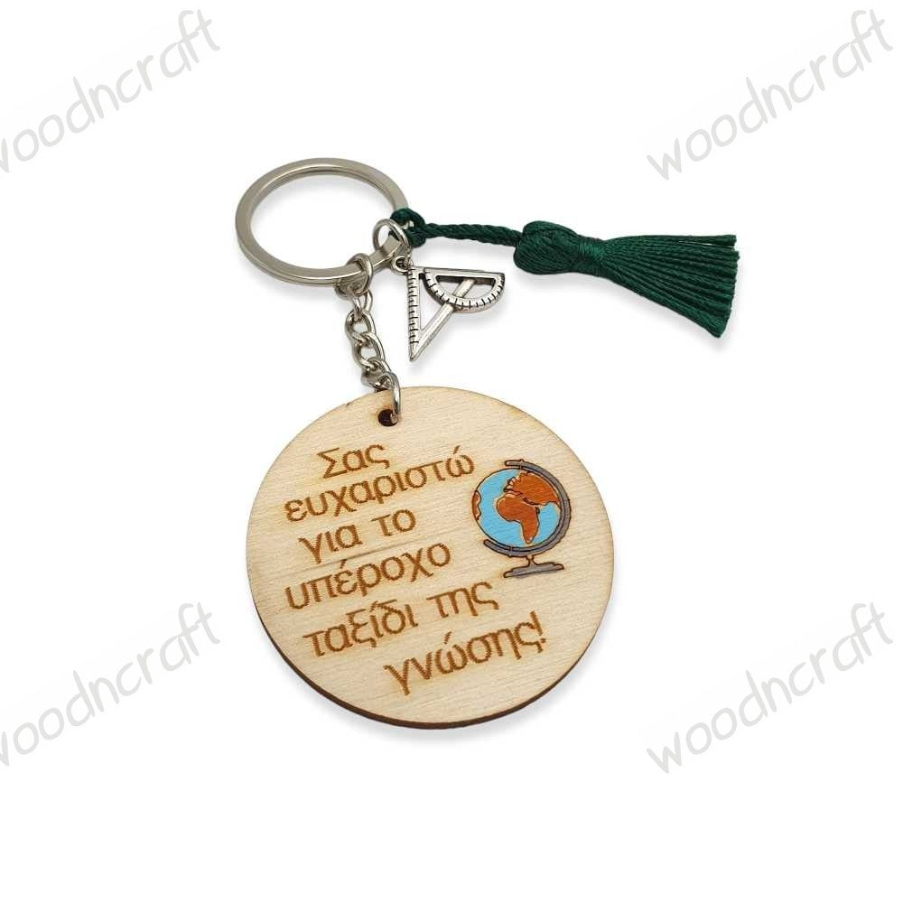 High-quality handmade wooden keychain with a globe and a thank-you dedication for the best teacher! Made with a metal ring and silver-colored chain and decorated with a metal ruler element and a hanging tassel!