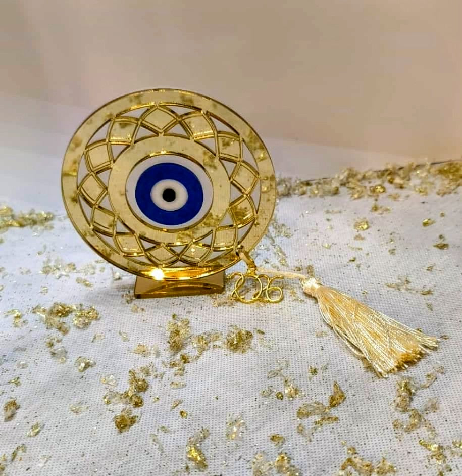 Γούρι σκαλιστό στρογγυλό μάτι σε χρυσό καθρέφτη με μπεζ χρυσό κρόσσι και χρυσό μεταλλικό 2026 .